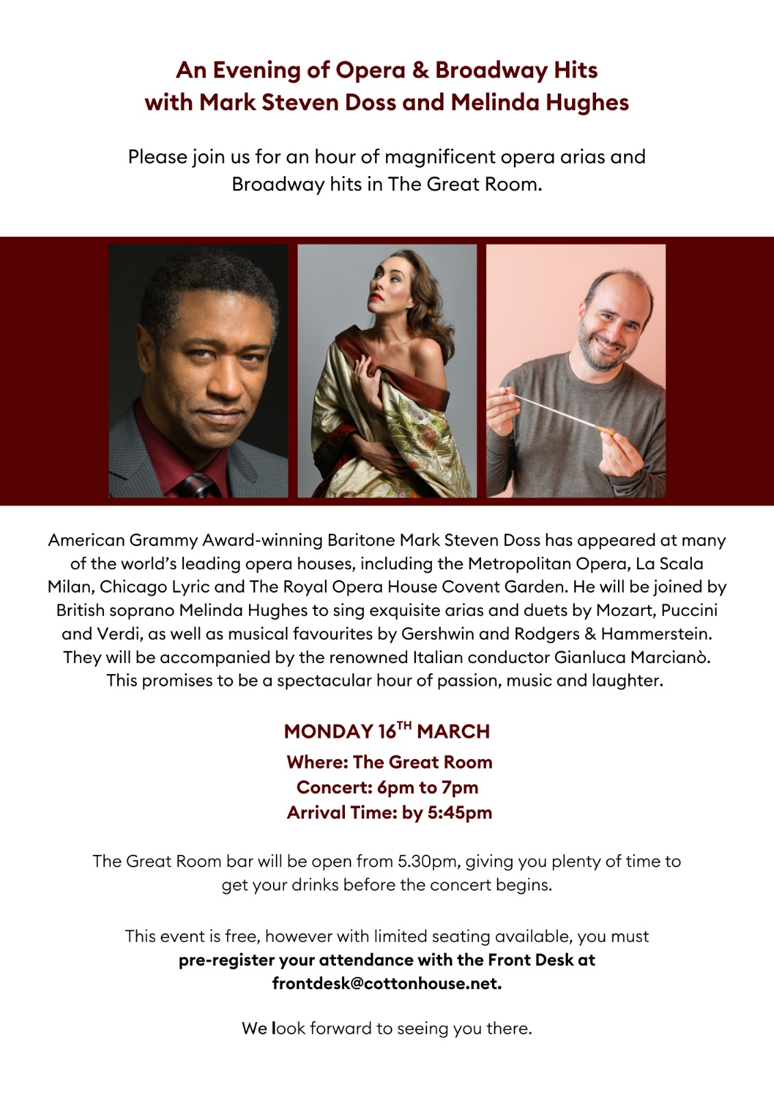 Updated Event Details: Please join us for an hour of magnificent opera arias and Broadway hits in The Great Room. American Grammy Award-winning Baritone Mark... Read more »