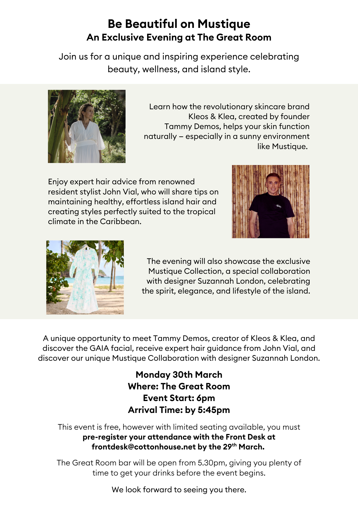 Join us for a unique and inspiring experience celebrating beauty, wellness, and island style. A unique opportunity to meet Tammy Demos, creator of Kleos &... Read more »